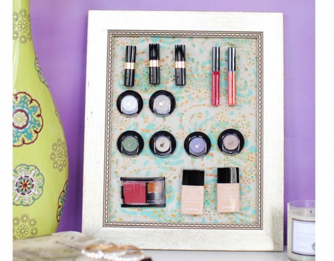 В інтернет-магазинах можна знайти безліч пристосувань для зберігання косметичних засобів на магнітах. А якщо трохи попрацювати, то можна зробити магнітну дошку і самостійно. Просто покрийте лист металу тканиною і оформите всю конструкцію у рамку, а потім повісити її на стіну. Приклейте маленькі магнітики на дно або задню стінку косметичних засобів і прикріпіть їх до дошки.