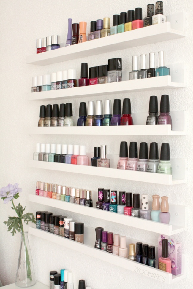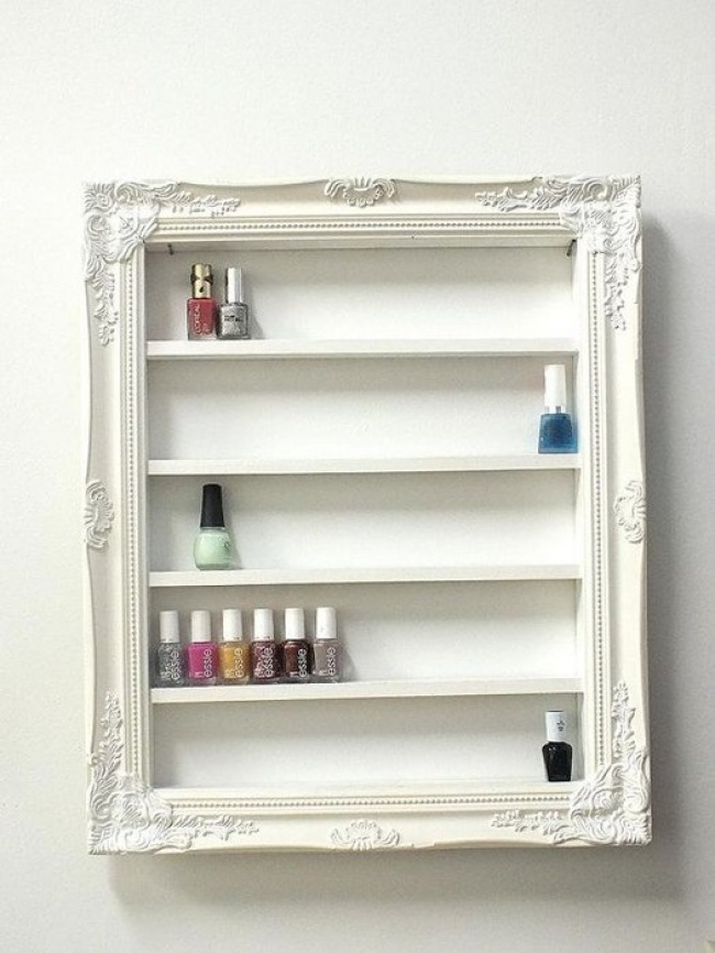 Багет також чудово підійде для наведення порядку. Для цього достатньо забезпечити його кількома вузькими поличками і розставити на них бульбашки з лаком для нігтів. При бажанні завжди можна перефарбувати в будь-який колір, щоб він поєднувався з іншими предметами інтер'єру.