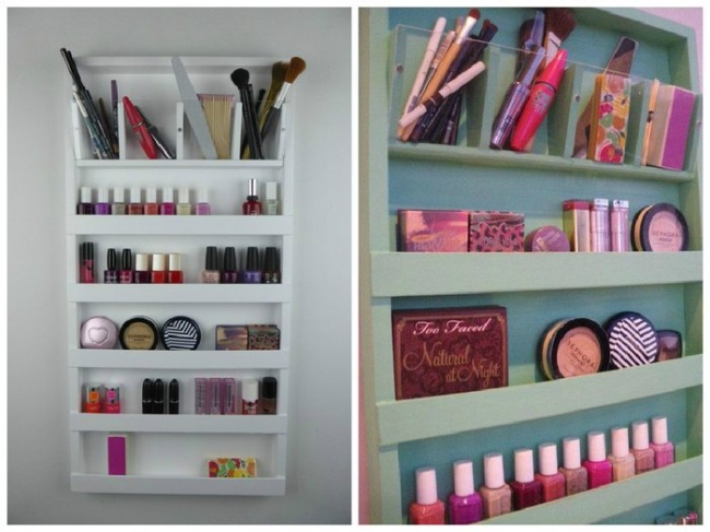Молдинги і плінтуси, що залишилися після ремонту, також можуть послужити добру службу. Достатньо лише встановити їх на стіну. Тут зручно зберігати лаки для нігтів і негабаритні помади або тіні.
