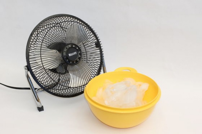 Цей спосіб може цілком замінити кондиціонер. Ставимо чашу з льодом, або пляшку з холодною водою перед вентилятором, і він поширює по дому холодне повітря, вбираючи в себе вологу від підталого льоду.