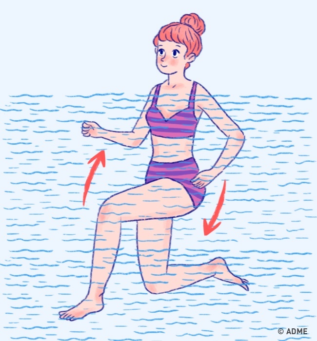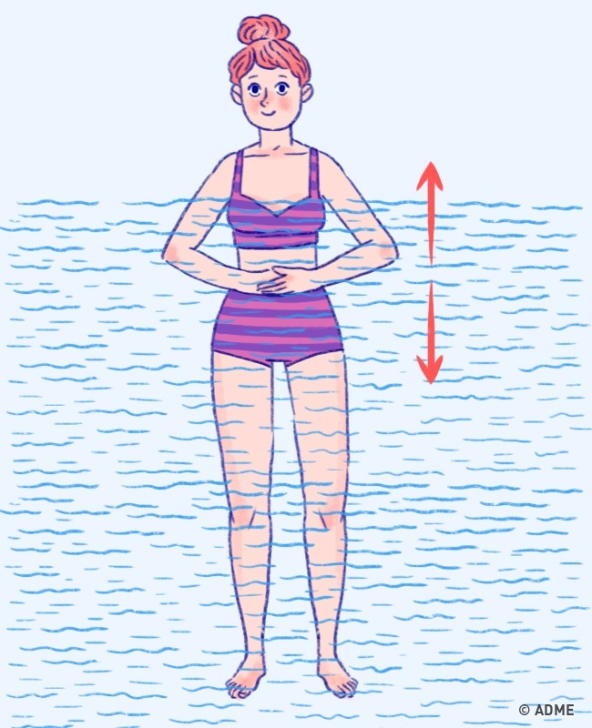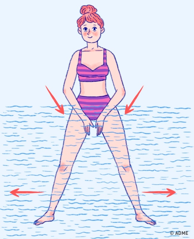 Стоячи у воді, завжди випрямляйте спину і втягуйте живіт. Для більшої ефективності можна також виконувати легкі нахили корпуса вперед і назад. Так покращиться постава ще швидше.