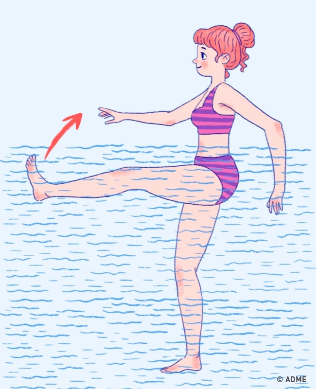 Стоячи у воді, витягніть руки перед собою і підніміть ногу. Намагайтеся дотягнутися ногою до пальців рук. Кожну вправу виконайте по 10 разів для кожної ноги. Можна робити помахи в сторону, це теж ефективно.