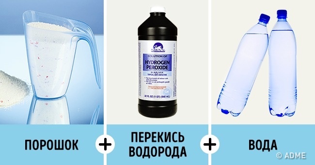Розмішуємо чверть чашки миючого засобу в 2 л води і додаємо чверть склянки перекису водню.