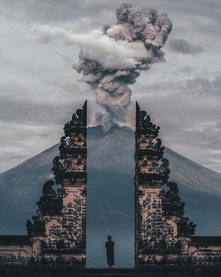 8. Доглядач храму спостерігає за виверженням вулкана на Балі