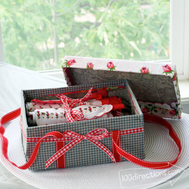 Прилаштувавши ручки і прикрасивши тканиною, ви отримаєте коробку, в якій досить зручно переносити прилади та частування для літнього пікніка. Детальніше про це тут.