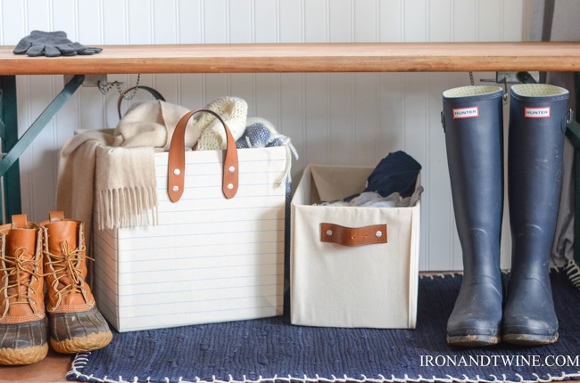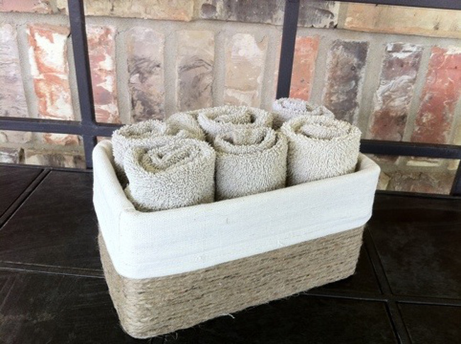 Якщо обтягнути коробку джутом, вона стане схожа на модний вінтажний аксесуар, в якому відмінно помістяться мочалки або рушники. Схема її виготовлення тут.