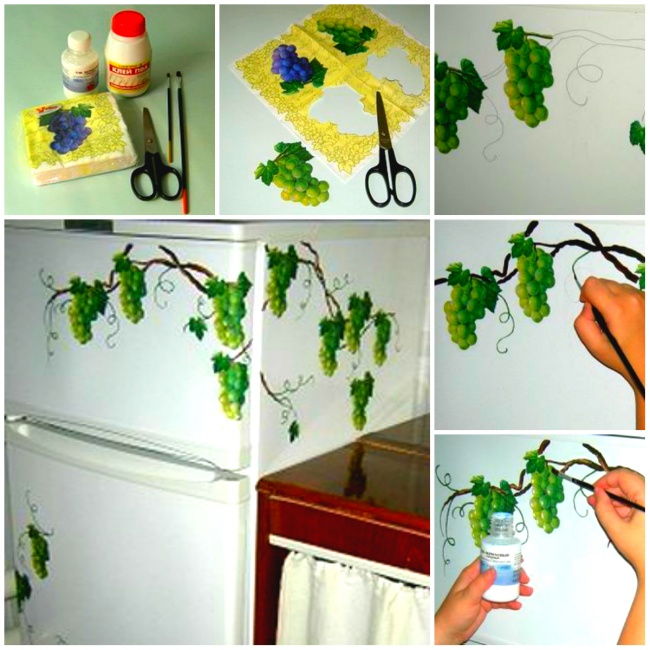Перетворити холодильник допоможе і техніка декупаж. Для оновлення потрібні серветки з красивим малюнком, клей ПВА, пензлик, акрилові фарби, акриловий лак. Покрокову інструкцію можна подивитися в майстер-класі тут.