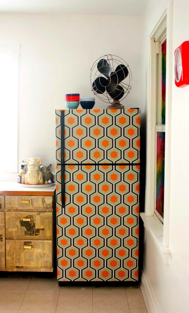 Відмінна ідея для любителів легкого ретро. Лише потрібні відповідні за стилем самоклеючі шпалери або плівка і півгодини вільного часу. Акуратно обклеюємо поверхні холодильника ось так.