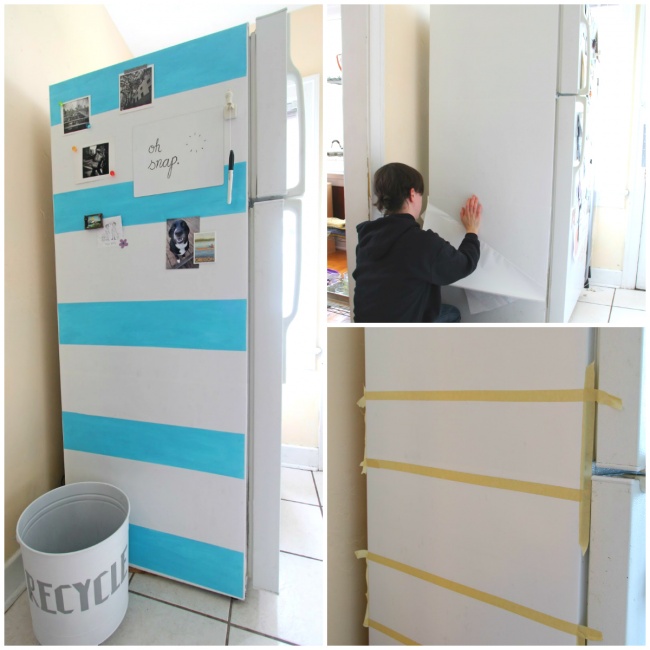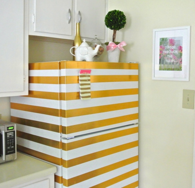 Навіть якщо перетворити всього одну стінку холодильника, на кухні з'явиться зовсім інший настрій. Зробити це можна за допомогою самоклеючої плівки, яка прибере зайву фактуру поверхні, фарби і малярного скотча. Подробиці у майстер-класі. Звичайно, можна вибирати будь-які кольори і напрямок смужок.