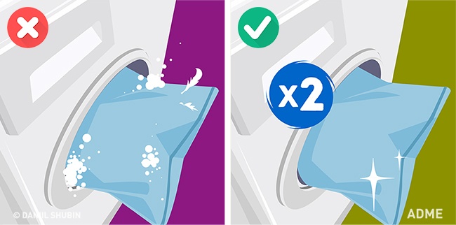 Один цикл для подушок і ковдр. Якщо перете пір'яні подушки і ковдри в машинці, то прокрутіть їх двічі: пір'я затримують піну і після одного циклу миючий засіб може залишитися всередині.
