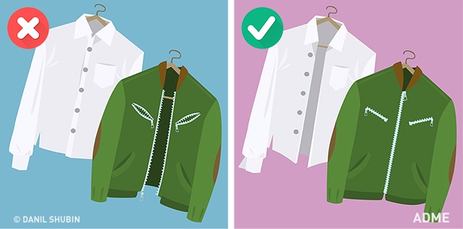 Гудзики застебнуті. А ось гудзики у сорочок і іншого одягу краще розстебнути. Інакше вони можуть відірватися, а нитки швидко прийдуть в непридатність.