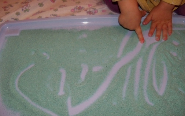 - Малювати на манній крупі пальчиком, паличкою або пензликом (крупу можна попередньо розфарбувати харчовими або природними барвниками, як це зробити, читайте тут).