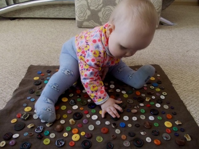 - Зробити «розвиваючий килимок» із цупкої тканини, нашив на нього яскраві гудзики різної форми (гра підійде навіть для зовсім маленьких).