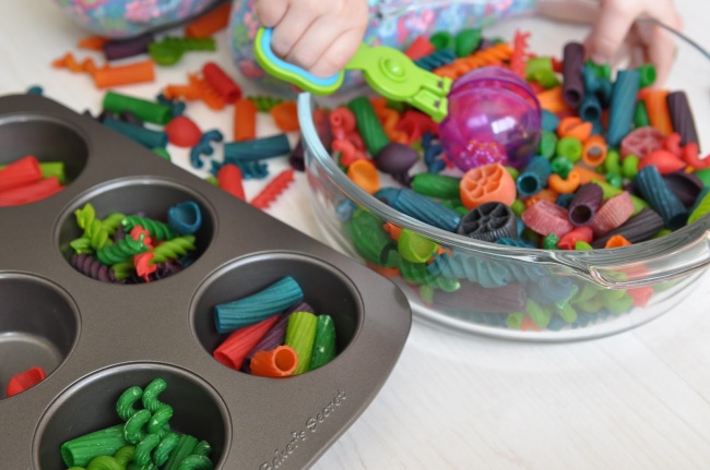 - Сортувати фігурні макарони по ємностях (щоб дитині було веселіше грати, можна заздалегідь розфарбувати макарони харчовими барвниками або гуашшю).