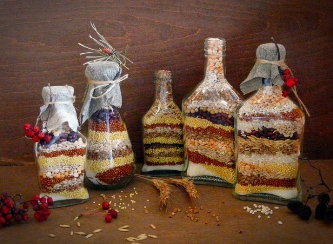 Перетворити пляшки з непотрібної тари в незвичайний елемент декору не так вже й складно. Все, що вам знадобиться, — це самі пляшки, різна крупа і трохи фантазії. Подробиці тут.