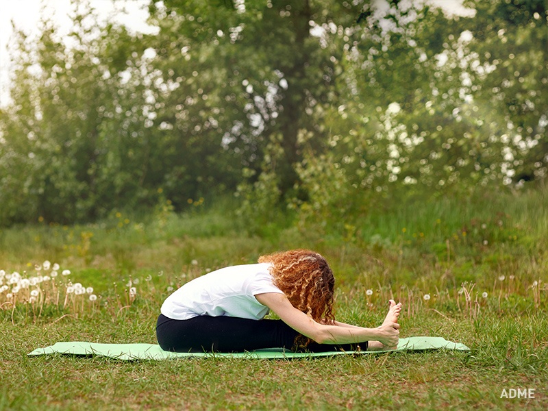 - Сядьте на сідниці, випряміть ноги. Шкарпетки стоп направте на себе, задні частини колін притисніть до підлоги.