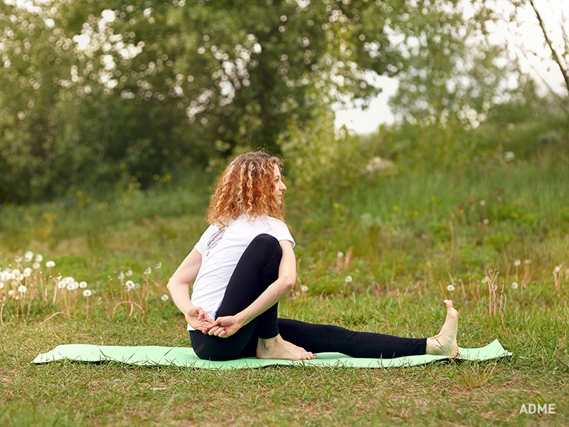 - З видихом розгорніть корпус вліво, зачепившись плечем за ліве коліно. Вдихніть і з видихом обвейте правою рукою коліно і з'єднайте руки за спиною. Направте погляд назад. Не піднімайте сідниці від підлоги. Дихайте рівно.