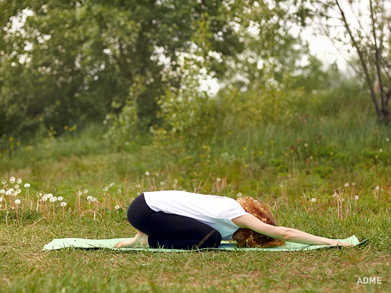 - Повільно нахиліться вперед. Опустіть живіт на стегна, а голову на килимок. Коліна можна розвести в сторони, живіт і груди спрямувати до килимка.
