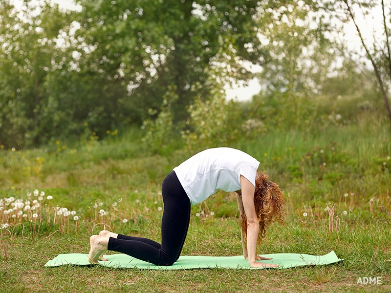 - На видиху, починаючи від куприка, опустіть його, округлите спину і опустіть голову. Підборіддя по можливості притисніть до грудей, живіт втягніть, подивіться в область пупка. Спина і таз прагнуть вгору.
