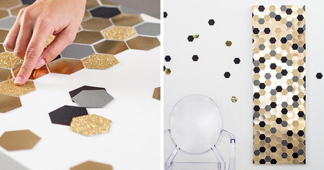 У вас залишилися оздоблювальні матеріали? Застосуйте їх у створенні такого ж чудового настінного панно з шестикутників, як вийшло ось тут.