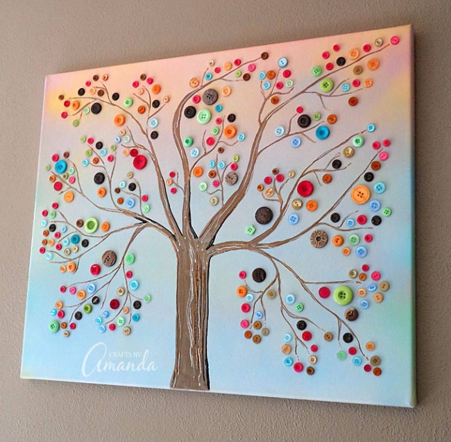 Пуговичное дерево виросте на стіні без особливих зусиль, варто лише намалювати стовбур і прикрасити гілки непотрібними різнокольоровими ґудзиками, як це зробили тут.
