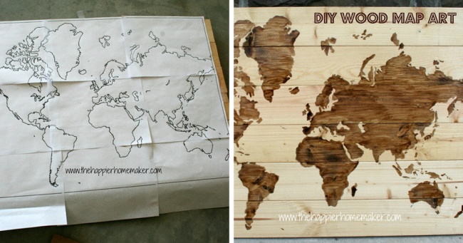 Запаморочлива ідея: роздрукована і перекладена на дерево карта світу прекрасно сусідить з непотрібною дошкою.