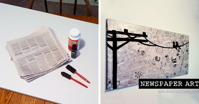 Хаотично розташовані на ватмані шматочки старих газет створять прекрасне прикраса для стіни. Покрокову інструкцію можна знайти ось тут.