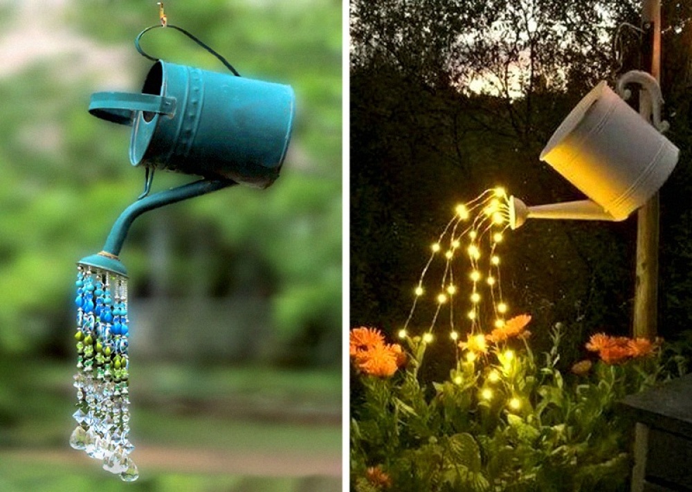 З старої лійки можна зробити чудове прикраса для саду, просто додавши різнокольорові намистини. Або поексперементувати зі світлом, доповнивши лійку невеликий гірляндою. Докладний майстер-клас — тут.