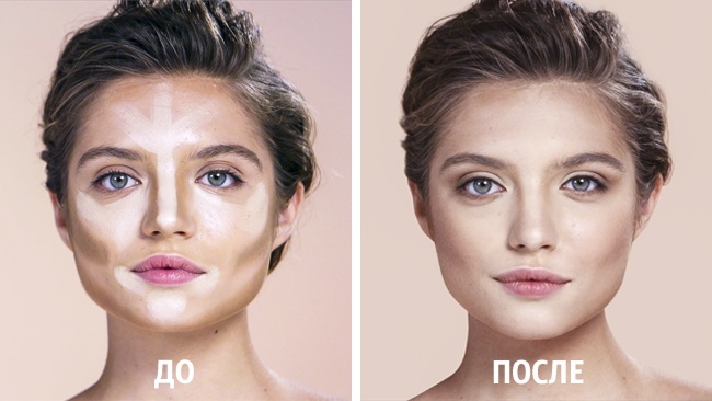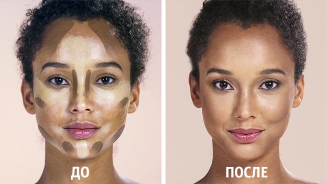 Для корекції овального обличчя необхідно затемнити підборіддя і лоб біля лінії росту волосся. Для того щоб, навпаки, зробити вузьке обличчя широким, на яблучка щік потрібно нанести рум'яна у вигляді кола без подовження до скронь.