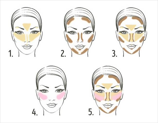На цьому малюнку покроково зображені основні етапи контурування, але запам'ятайте основне правило: высветляйте ті місця, які ви хочете підкреслити, і затемняйте ті, які хочете приховати.