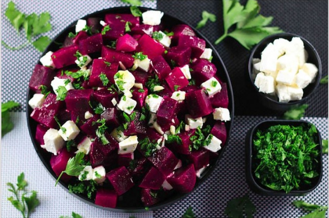 Відваріть буряк до готовності, остудіть, очистіть. Буряк і сир фета наріжте кубиками. Петрушку дрібно нарубаєте. Для заправки змішайте лимонний сік, оливкова олія і перець. Посоліть салат, залийте заправкою і обережно перемішайте.