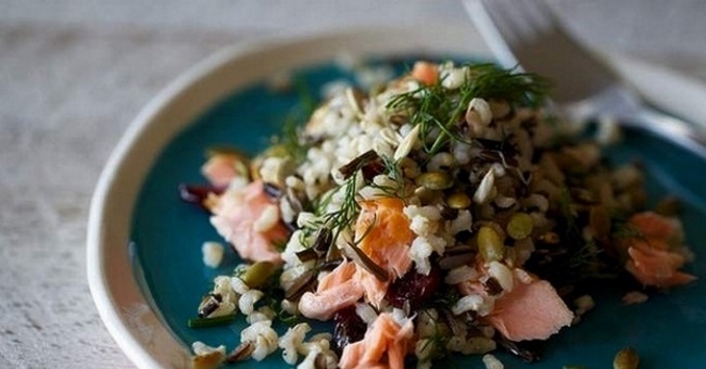 Відваріть рис у великій кількості води. Поки він вариться, наріжте лосось невеликими шматочками. Злегка обсмажте на сухій сковороді насіння і горішки, постійно перемішуючи. Для заправки змішайте оливкова олія з медом, додайте сіль і спеції. Злийте воду з рису, остудіть його. Викладіть в салатник рис, рибу і насіння з горішками. Залийте заправкою і перемішайте.