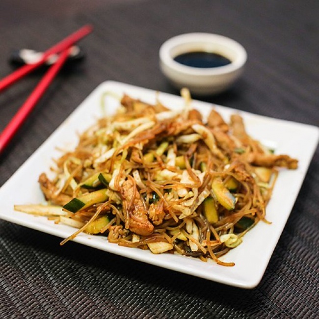 Окремо в добре розігрітій олії обсмажити баклажани, нарізані смужками. Відварити фунчозу, як зазначено на упаковці, промити її і змішати з м'ясом і баклажанами. Подавати салат можна і холодним, і гарячим, заправивши зеленню.