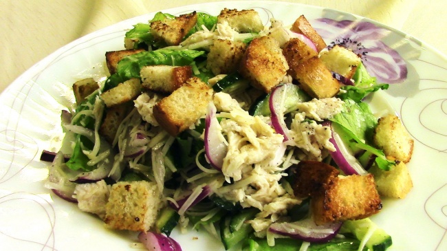 Обсмажте кубики батона в олії до золотистої скоринки. Наріжте відварне куряче філе і огірки дрібними шматочками, цибулю — півкільцями, а сир натріть на тертці. Для заправки змішайте рослинне масло, подрібнений часник, оцет, сіль і перець. Складіть все, крім салату і сухариків, в миску і залийте заправкою.