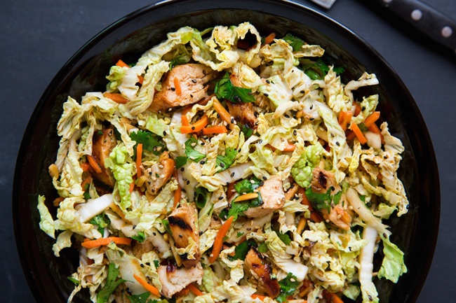 Для заправки у невеликій мисці змішайте соєвий соус, оцет, оливкова і кунжутне масло, сіль і дрібно порізані цибулю і імбир. Ретельно перемішайте і дайте настоятися. В цей час натріть моркву на великій тертці, тонко поріжте пекінську капусту дрібно порубаєте кінзу. Куряче філе відваріть і розділіть руками на великі шматочки. Овочі і куряче філе покладіть у велику салатницю, додати кунжут, кешью, заправку і добре все перемішайте. Дуже смачний салат, від якого всі будуть в захваті, готовий.