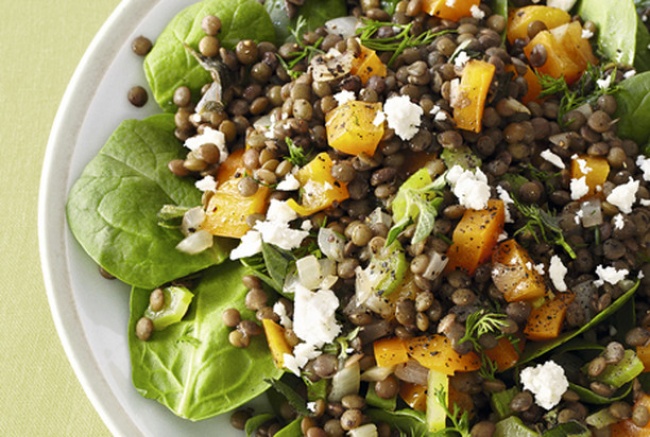 Викладіть в каструлю сочевицю і залийте 3 склянками води. Доведіть до кипіння, потім зменшіть вогонь і варіть півгодини. Нарізані цибулю і селеру обсмажте в оливковій олії. Через пару хвилин додайте нарізаний соломкою солодкий перець, сіль, спеції і 2 ст. л. води. Тушкуйте протягом 5 хвилин. У готову сочевицю покладіть тушковані овочі, оцет, сіль і спеції. Перемішайте і прикрасьте салат листя молодого шпинату, сиром і кропом.