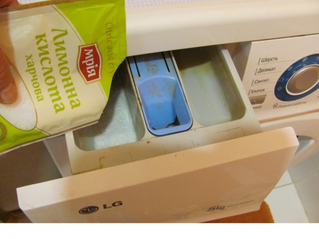 Очистити машину від накипу і водного каменю допоможе звичайна лимонна кислота. У відсік для порошку засипаємо 60 грам лимонної кислоти. Запускаємо машинку на повний цикл прання з максимально високою температурою.