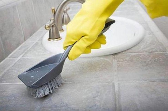 Змішуємо теплу воду з перекисом водню в пропорціях 2:1. Щіткою або губкою чистимо шви між плитками цим розчином, який потім можна не змивати.