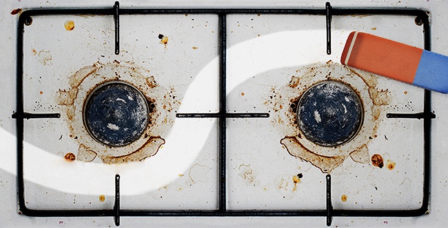 Прибираємо жир з поверхні плити і із дрібних деталей звичайною гумкою. Цим способом користуються співробітники професійних клінінгових служб.