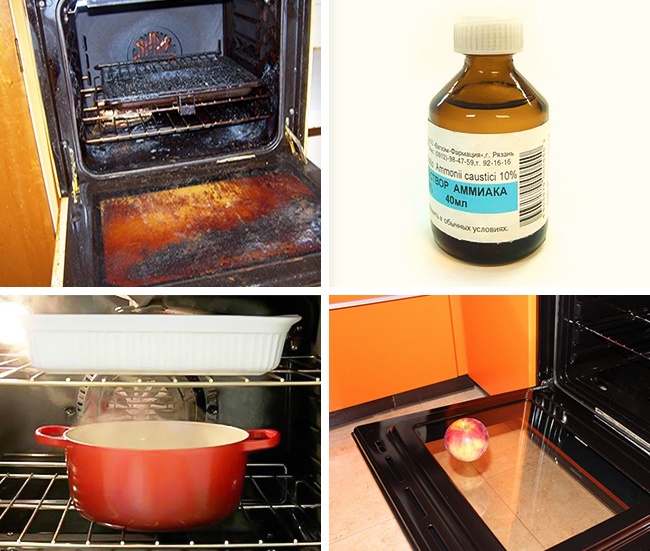Вранці в ємність з нашатирем додаємо кілька чайних ложок будь-якого миючого засобу і півчашки теплої води. Губкою з отриманим розчином протираємо духовку і промиваємо її водою.