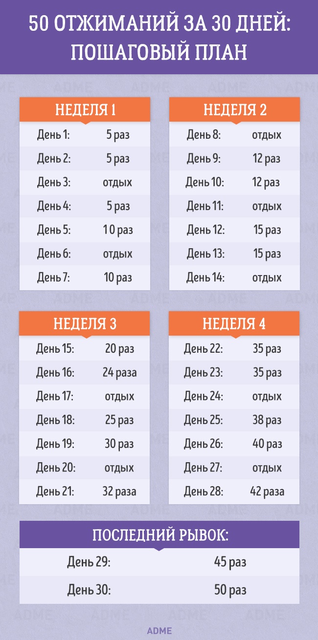 Social.org.ua ділиться простою методикою, як за місяць навчитися робити по 50 віджимань за раз: суть в тому, щоб почати з малого і поступово збільшувати навантаження.
