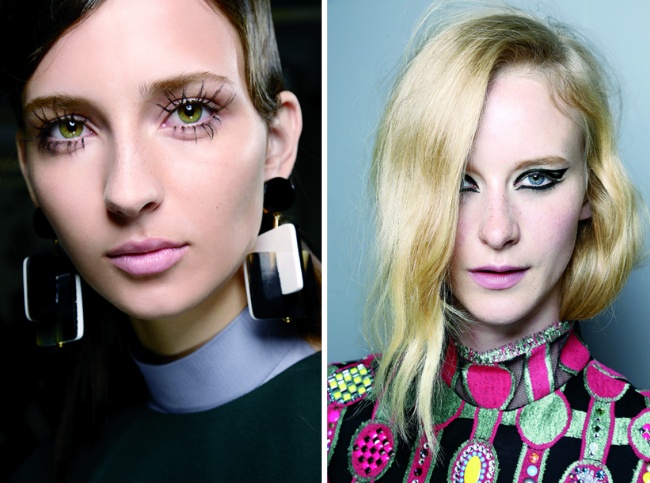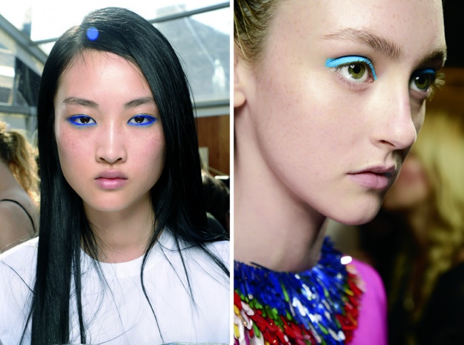Один з головних трендів макіяжу в цьому сезоні – яскраві очі з використанням випуклих, рельєфних елементів. Цей тренд головував на багатьох показах. Щоб зробити акцент на очі, дизайнери пропонують використовувати тіні яскравих відтінків (помаранчевий, блакитний, зелений, рожевий), а також декоративні стрази і блискітки. Також популярні тіні теплих, сонячних відтінків: мандаринові, абрикосові й коралові.