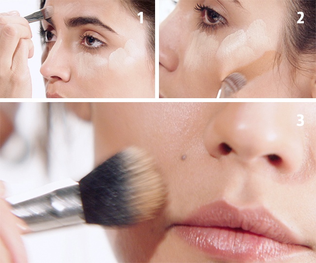 Основні виступаючі зони можна легко освітлити: нанесіть хайлайтер на лінію лоба, верхню частину скул, перенісся і під очима. Потім нанесіть контур на щоки і на обидві сторони носа. Ретельно розтушуйте.