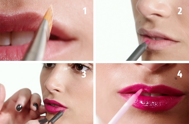 Щоб додати губам додатковий обсяг, нанесіть пензликом світлі тіні, підводка або пудру по центру губ. Нанесіть олівець і помаду. Так губи будуть здаватися об'ємніше.
