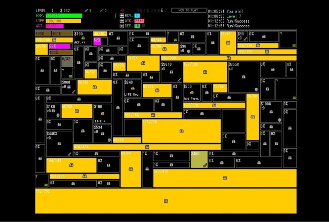 Вершина мінімалізму RPG. Чорні прямокутники — квести, жовті прямокутники — боси. Все, що від вас вимагається — просто клікати по них, отримуючи досвід і ключі.