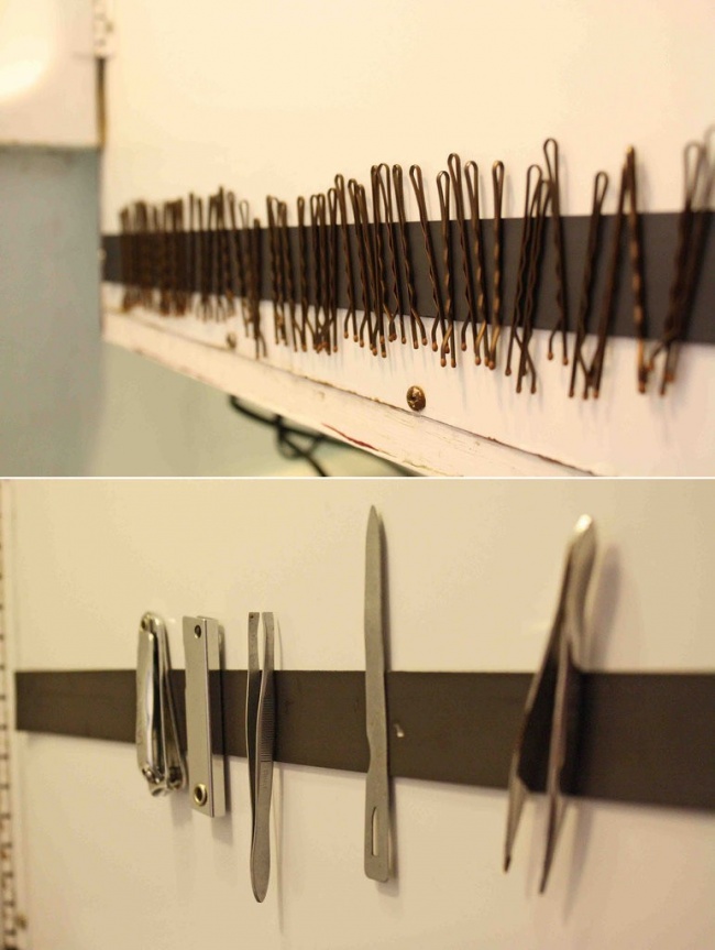 28. Магнітна стрічка — відмінний спосіб зберігати шпильки, щипчики, ножиці та інші предмети у ванній.