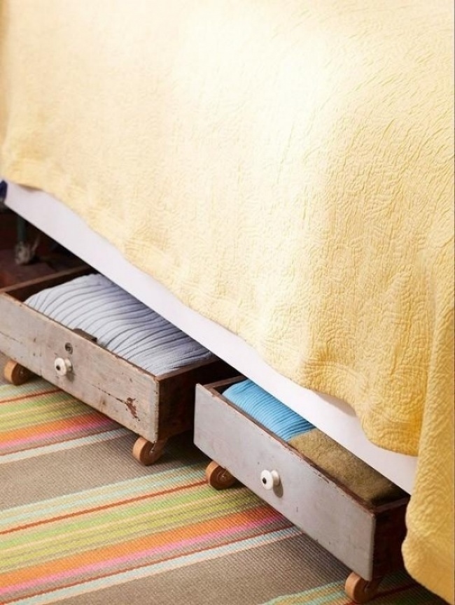 40. Такі ящики дозволять використовувати місце під ліжком. Ви можете зробити їх самі, прикрутивши до старих ящиків колеса.