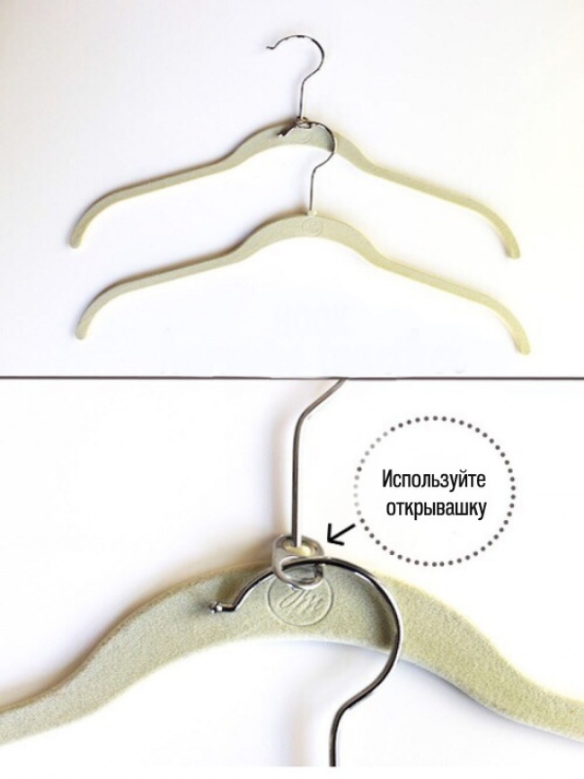 24. Подвійте простір шафи, причепивши одну вішалку до іншої з допомогою відкривачки від жерстяної банки.