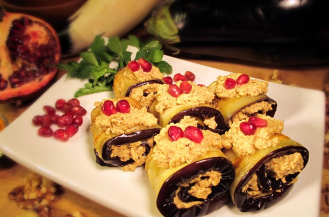 - На кожну скибочку баклажана намажте шар горіхової пасти. Сформуйте рулетики. Прикрасити зернами граната і зеленню.