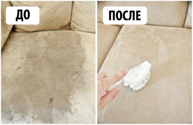 Нанесіть невелику кількість спирту на губку і протріть місця забруднень. За допомогою щітки приведіть в порядок ворсинки і мікроволокна диванної оббивки. Щоб позбутися неприємного запаху, нанесіть невелику кількість соди.
